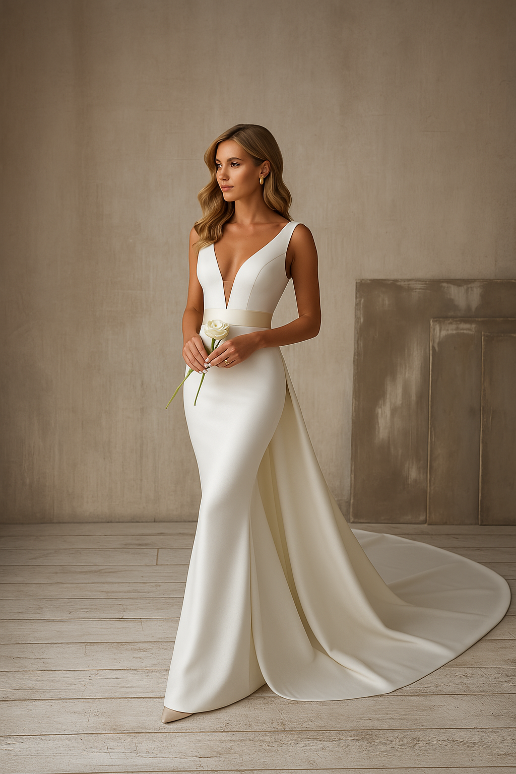 ليلى | فستان زفاف طويل مع ياقة على شكل V بدون أكمام وذيل