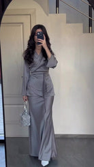 تجمع هذه المجموعة المكونة من قطعتين بين المظهر الراقي والراحة المطلقة. تتكون من بلوزة بأكمام طويلة مزودة بحزام وتنورة طويلة واسعة، مما يخلق شكلًا أنيقًا وأنثويًا. مثالية لتجميل لحظاتك اليومية ومناسباتك الخاصة.