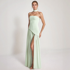Este vestido longo valoriza a silhueta graças ao seu corpete estruturado e sem alças. A fenda lateral traz um toque de feminilidade e confiança. Ideal para noites elegantes, combina charme e conforto.