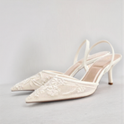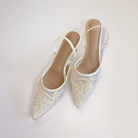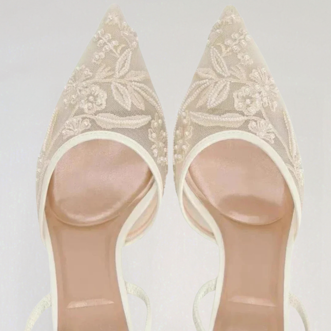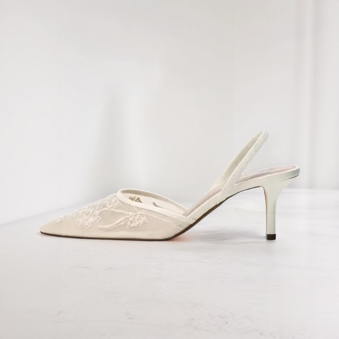Tyto boty na podpatku se vyznačují jemnou květinovou výšivkou na pevném, lehkém a průhledném svršku. Jejich špičatý tvar prodlužuje siluetu s elegancí, zatímco nastavitelný pásek zajišťuje bezpečné uchycení a dodává nádech rafinovanosti.