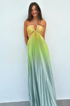 Tato dlouhá plisovaná šaty vytváří plynulou a přirozeně elegantní siluetu. Její americký výstřih jemně zvýrazňuje ramena. Volány dodávají celku dotek rafinovanosti.
