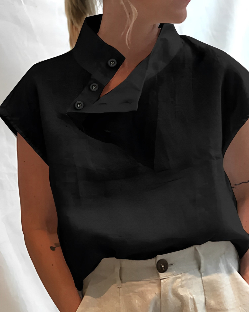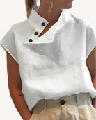 Tato blůza spojuje jedinečný design s vynikajícím pohodlím. Její stojatý límec s knoflíky dodává vašemu outfitu sofistikovaný nádech. Ideální jak na výlet do města, tak na večeři v jednoduchosti.