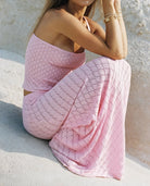 Αυτή η γυναικεία σύνθεση συνδυάζει ένα τοπ χωρίς τιράντες με μια μακριά φούστα με ροζ και λευκές ρίγες. Η ρέουσα και ελαφριά γραμμή της την καθιστά ιδανική για ηλιόλουστες μέρες. Τέλεια για τις καλοκαιρινές σας περιστάσεις, συνδυάζει άνεση και κομψότητα με στυλ.