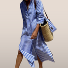 このストライプシャツドレスは、ゆったりとした流れるようなシルエットが魅力です。ボタン付きデザインと長袖が、カジュアルでエレガントな印象を与えます。晴れた日のために最適です。
