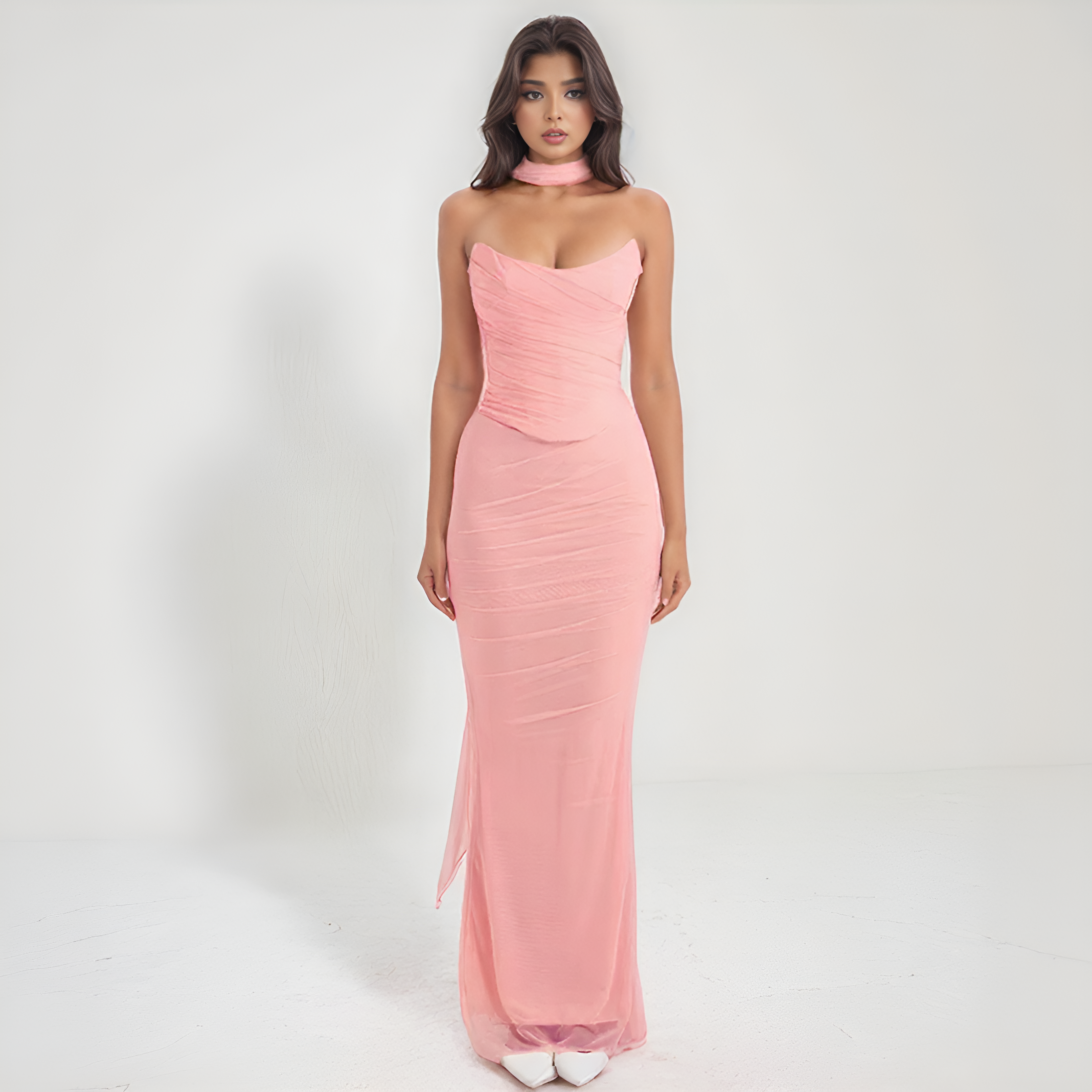 Denne to-delte modellen kombinerer en stroppeløs topp med korsettform og en lang, tilpasset skjørt for å fremheve silhuetten. Hver detalj fremhever en elegant og moderne stil. Et perfekt antrekk for dine mest raffinerte anledninger.