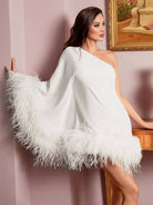 Este vestido curto trapézio com uma manga é ideal para ocasiões especiais. O seu design único com mangas de capa adiciona um toque de sofisticação. Perfeito para cocktails, bailes ou festas.