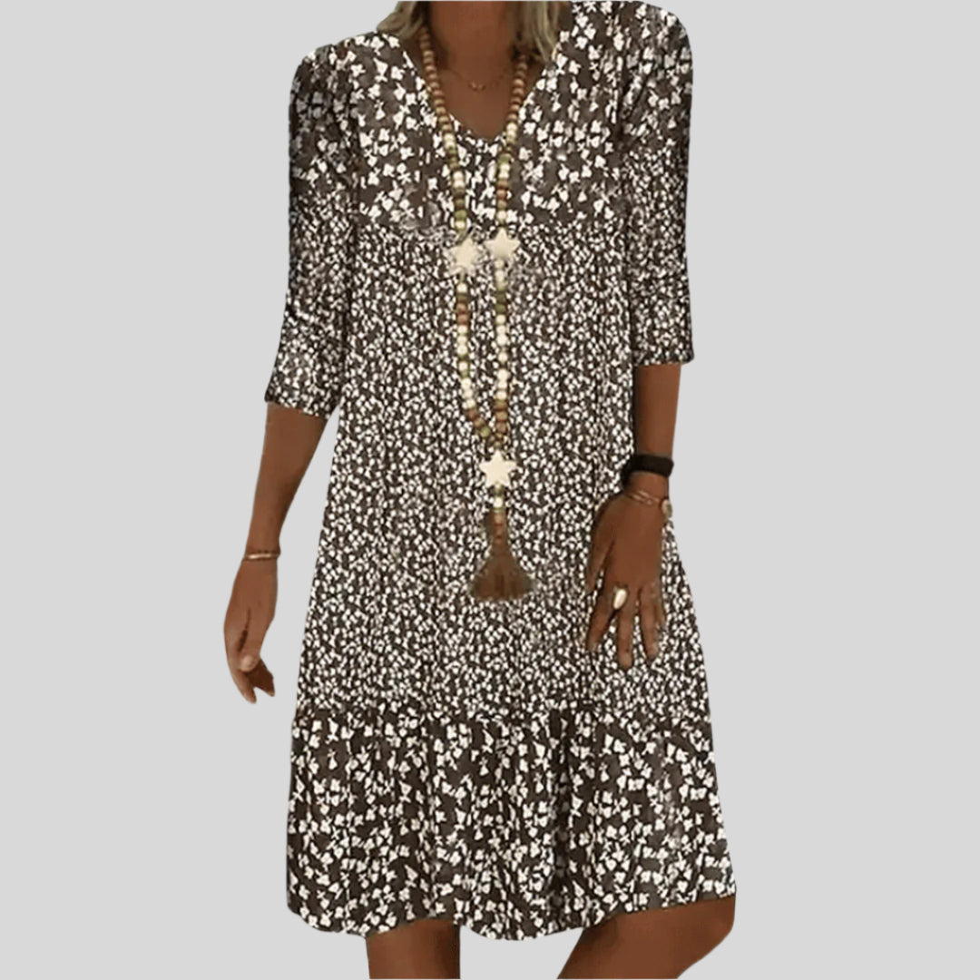 Este vestido midi apresenta um decote em V lisonjeiro e um corte elegante. Disponível em várias cores, adapta-se a diversas ocasiões. O seu design intemporal garante um ar sofisticado.